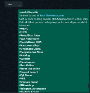 4. Setting Whatsapp Auto Respon (Customer Service Whatsapp) yang akan otomatis menjawab ketika ada chat masuk sesuai kode yang ditentukan, sangat berguna ketika anda sibuk dan tidak sempat membalas serta tidak ingin customer kecewa menunggu jawaban anda. sistem bot kami akan membantu anda bekerja lebih efektif dan efisien. contoh penerapannya bisa chat wa ke 6282335589393.